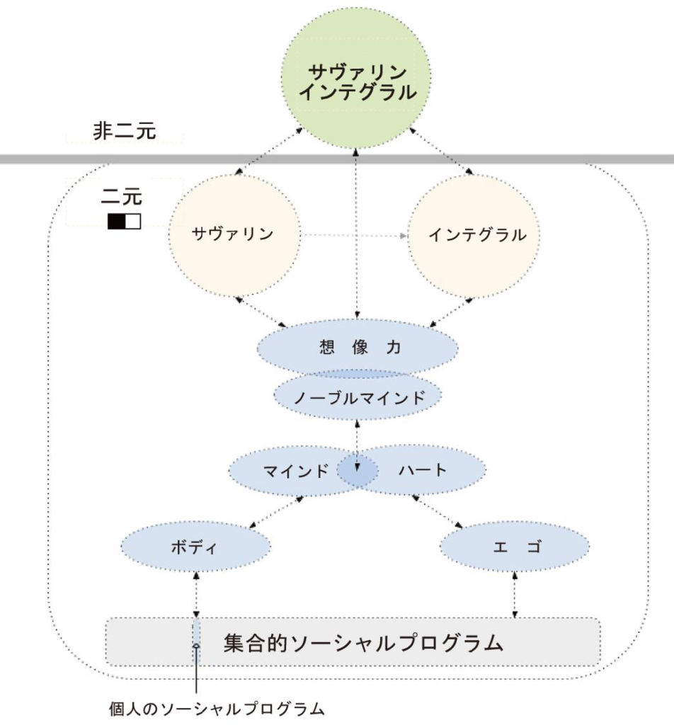 *2 二元性の世界の中では、種族の集合マインドが、特定の時空において合意されたリアリティに合意しています。これがソーシャルプログラムが共有する半分です。残りの半分は、サヴァリン(個)によって経験される、独自のソーシャルプログラムです。ソーシャルプログラムは、その双方を含んでおり、実質的にインテグラル(統合された全体)は、二元性の中に存在することになり、性質において二元的な存在の次元によって、その機能と能力が縮小されています。