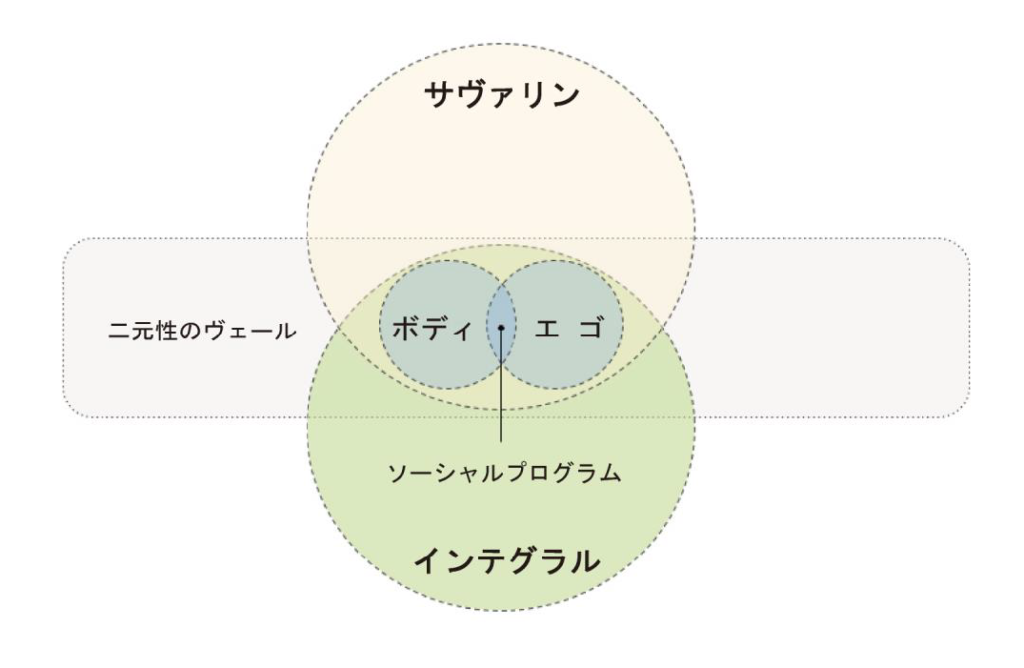 サヴァリンの、その独特なインテグラルとのつながりは、ボディとエゴ、そしてソーシャルプログラムによって切り離されています。それはまるで、ディナーの食卓から除外された子どものようです。「何でも持っていきなさい。でも、どこか他所で食べなさい」と。エゴは生存本能の副産物として現れます。そして後年、ソーシャルプログラムという厳しい現実から身を守るための盾となります。 先祖伝来のDNAは、性向や才能をボディに与え、エゴにも影響を及ぼすことがあります。今、私たちはボディとエゴと共に「ディナーの食卓」を囲んで座り、ソーシャルプログラムを仲間に加え、平穏に夕食を楽しんでいます。サヴァリンは追放されました。インテグラルは拒絶されました。