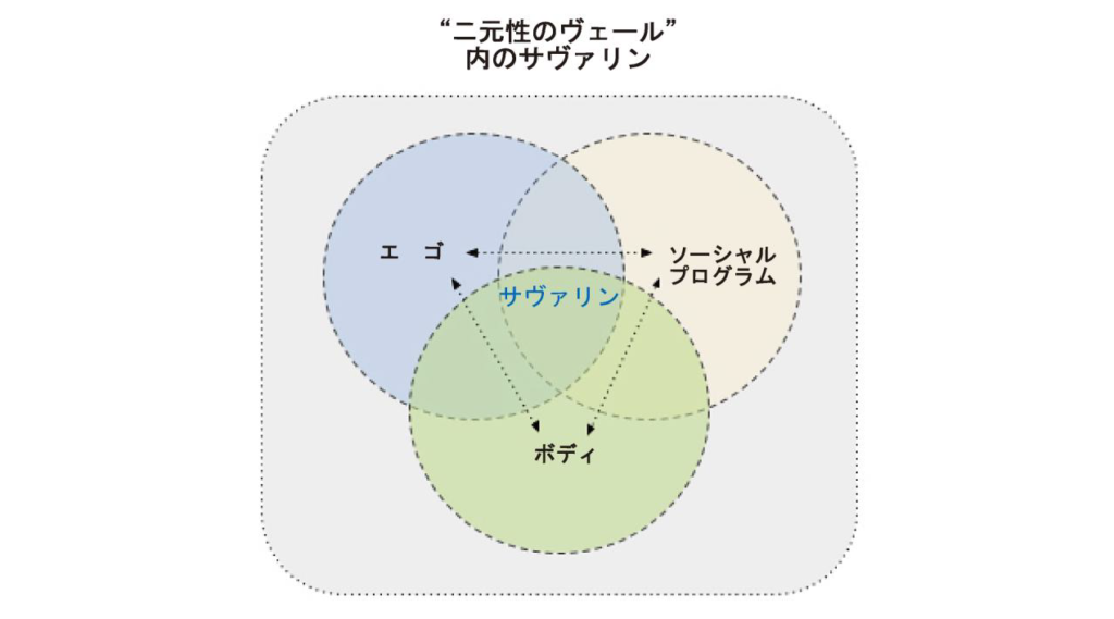 これは非常に重要な特質です。サヴァリン・インテグラルは、無限であり拡大する独自の意識です。それは二元的な世界と非二元的な世界の両方に同時に住んでいます。サヴァリンとは、個別化されたセルフであり、ボディ-エゴが存在しない時でも常に存在するコアとなるアイデンティティです。それは或る転生ライフタイム(生涯)から別の転生へと架かる橋であり、またそれらの転生そのものでもあります。しかし人間の身体に住む以上、ソーシャルプログラム*2という遍在する道標によって補助を受けながら、ボディ-エゴによってそのアイデンティティは偽装されます。