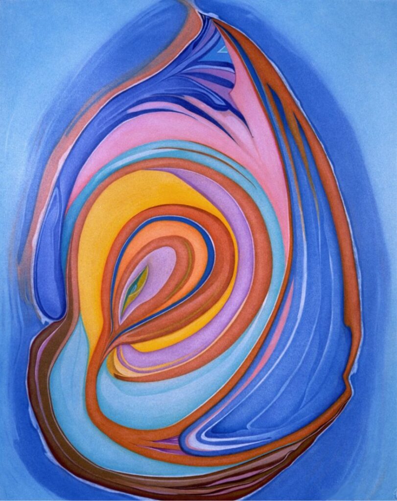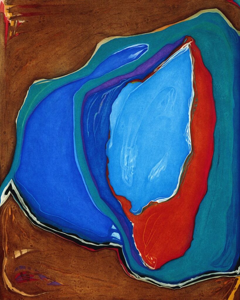 「エンシェント・アロー」シリーズのチェンバー10は、周波数に焦点を当てています。これらは、マンドルラ(チェンバー2の注記参照)を表す色の周波数であり、淡い水色の内部には、出現しつつあるUIS(アンデリバティブ・インフォメーション・ストラクチャー)を表す形態が見えてくるでしょう。土っぽい茶色はやがて緑や赤へと移っていきますが、この作品では、視線をとらえ、そして影響を与えるのは青の周波数です。