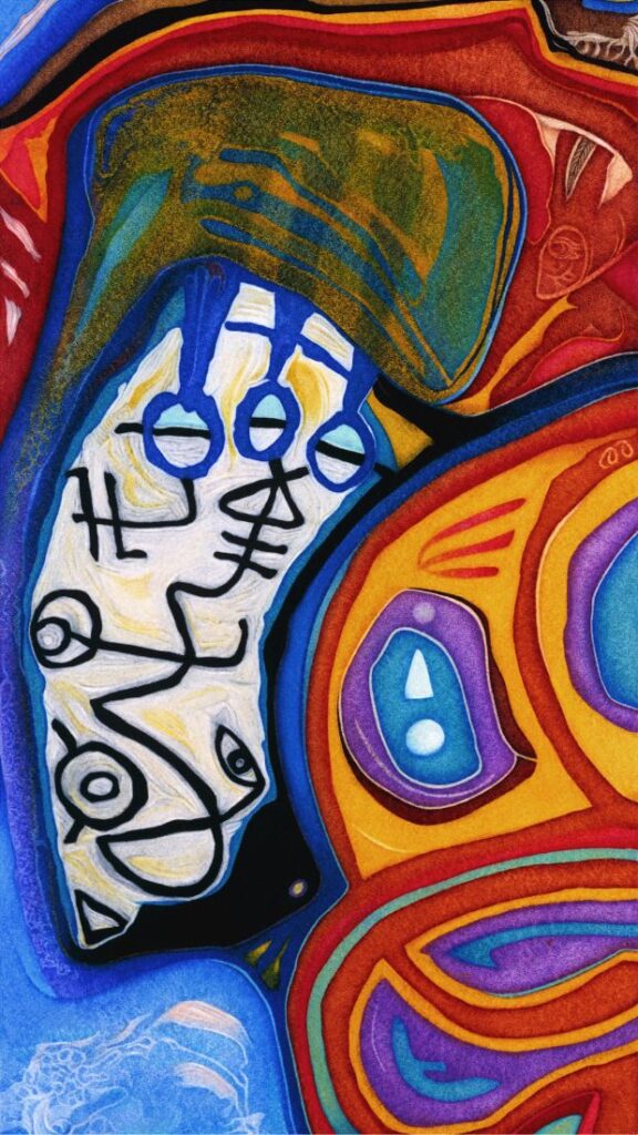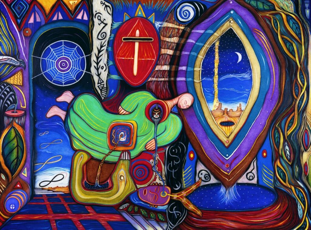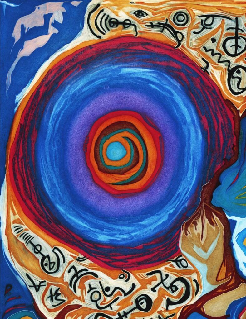 マンドルラはしばしば同心円状の色帯として描かれ、内側へ進むほど意識の高次元に至ること(第七の方向、とも呼ばれます)を示唆します。マンドルラは変容の地点であると同時に、量子的状態、あるいは静止点(スティルポイント)を覗き込むための「レンズ」でもあります。