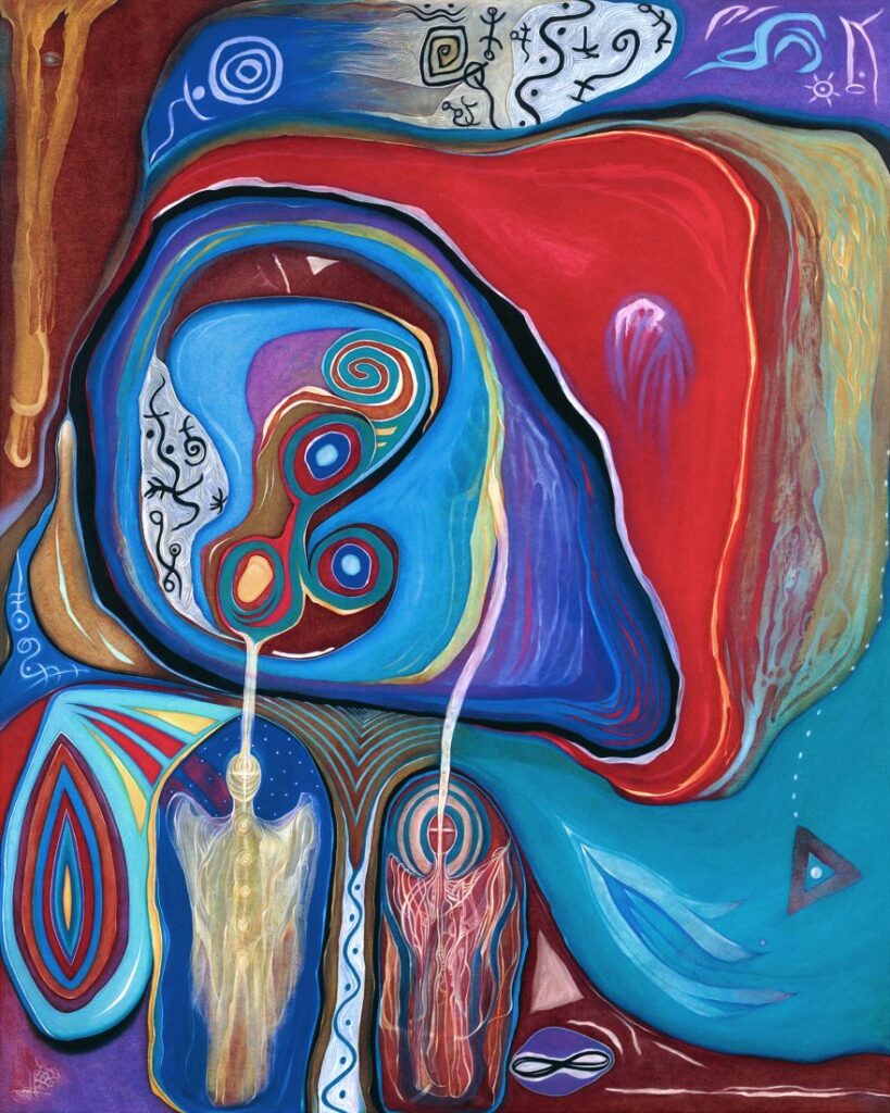 これは、チェンバー1の絵の右上隅で起きていること――赤いSIが、新しいGM(茶色の外殻/繭/鞘)と人類のあいだのコミュニケーションを吸収・濾過・処理し、それをFSが利用できる情報パケットへ蒸留する――の描写として非常に的確だ、と本文は述べます。UISの筋の背後には、深い宇宙的な青(FS)が広がっています(Part 1; Lock 2003)。螺旋状に伸びるUISの全長にわたり、ところどころで、小さな光の枝のようなもの(触手、エネルギーの小筋、情報パケット)が、広大なFSの青い“宇宙意識の海”へ向けて送り出されているように見えます。ウィングメーカー哲学によれば、このUISという導管を通じてGMと人類は進化し、絵の中で起きているGMと人類の変容を、私たちは観察できるのだ、とされます。UISとGMが接する部分では、GMの外殻の縁がより白く見える、とも述べられます。このUISを通じて流入するエネルギーにより、「誤解」に満ちた古く重いGMの部分が脱落し、人類とGM、ひいては地球が、より高い表現レベルへ進むことが可能になる、というわけです。