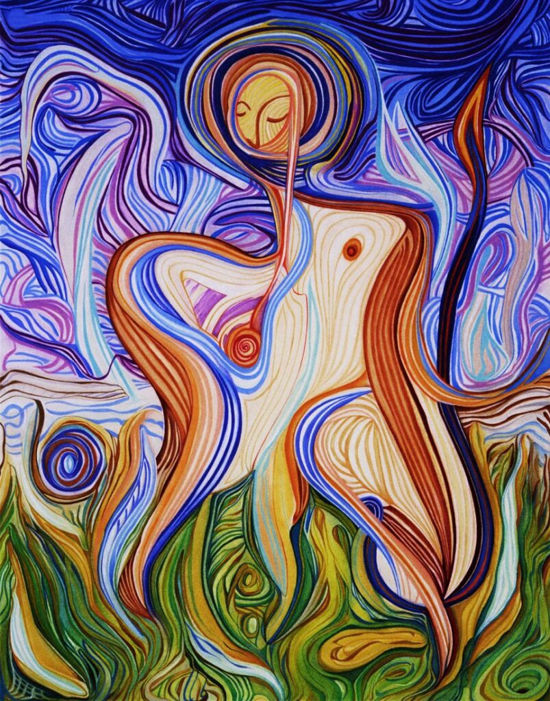 絵の最下部から見ていくと――人間の生命すべてに埋め込まれているホールネス・ナビゲーター(WN)を表す大きな根が、模様入りの帯の上を越えて下方へ伸びています。それらは、秘密の根を含むあらゆる根が絵の中で一つになる地点へと収束します。その地点は、赤い女性――すなわちサヴァリン・エンティティ(SE)――の土台/足元の中心にあり、彼女の背後には青いファースト・ソース(FS)の場が広がっています(図1)。力強いWNの根は、強い「中核の叡智」を表し、またヒューマン・インストゥルメント(Human Instrument/HI)の内部で絶えず展開していく「全体性(ホールネス)の知覚」を表しています。それらの根は、(おそらくアナサジの)赤い女性=HIを、聖母のようなサヴァリン・インテグラル(SvIg)、あるいは**エンティティ(E)**の意識と整列(アライン)させる方向へ引き寄せます。こうしてHIは、自分自身を「エンティティ意識の延長として」見るようになります。