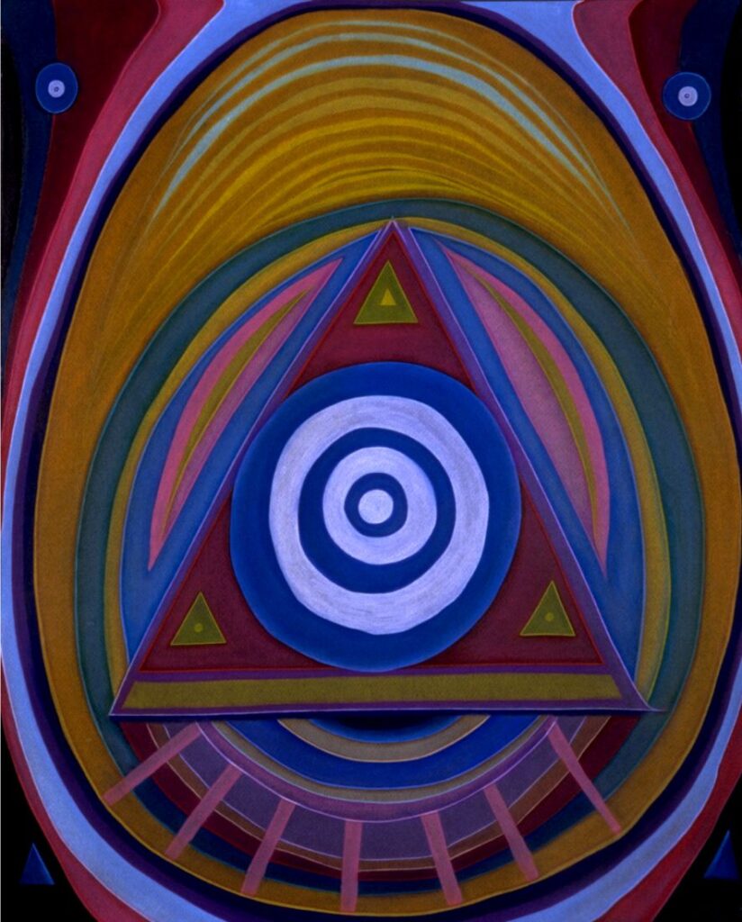 赤=四角形:均衡(秩序)、行為、エネルギー、死、意識、人の身体、大地、物質/石(1327)絵全体は、模様入りの黄色/金色の帯の上に立っています。この帯は、顕現した存在すべての統一性を抽象的に示しており、霊性に起源を持つ創造の原初的構成要素を含んでいます。この絵画では、黄色は霊の領域を表します。Chevalier と Gheerbrant(CG)は『ペンギン記号辞典』で、黄色を「神的な不死の乗り物」であり「神々の色」だと述べています(1137)。形(四角形)とエネルギー(三角形)は、霊、すなわち**ファースト・ソース(FS)**から生じます(P1, P3)。上部と下部の帯の縁にある深い青は、FSを示唆しています(後述)。