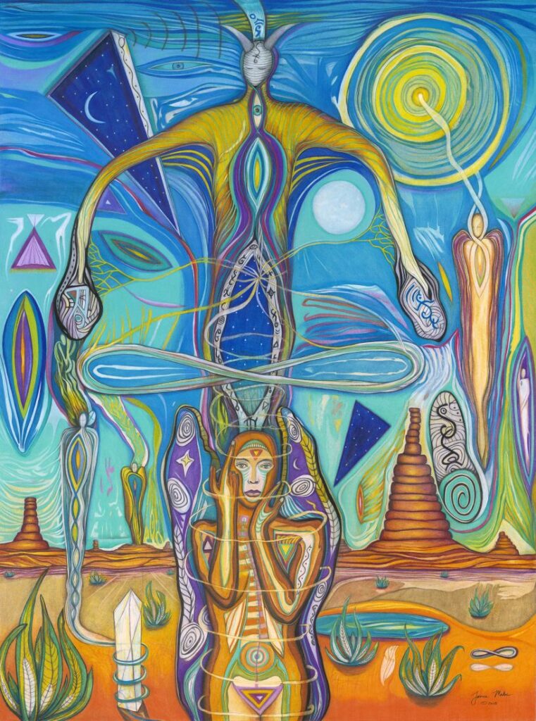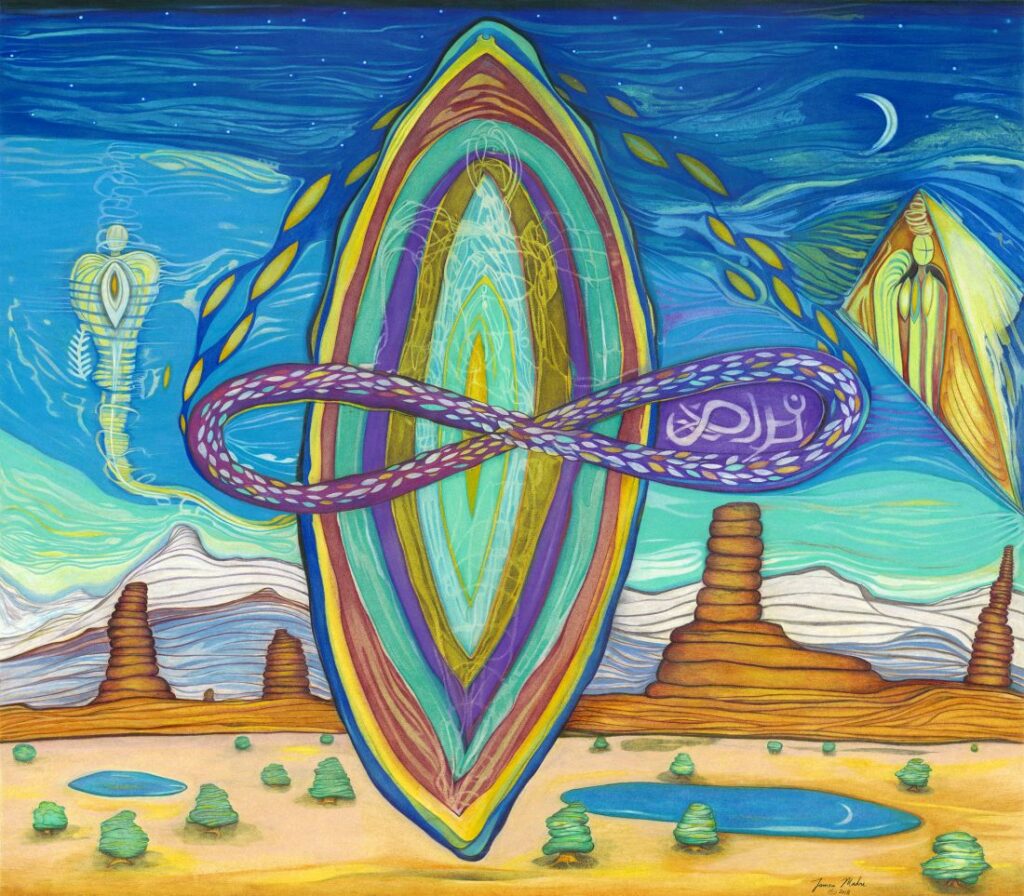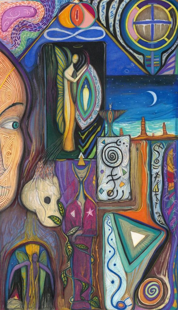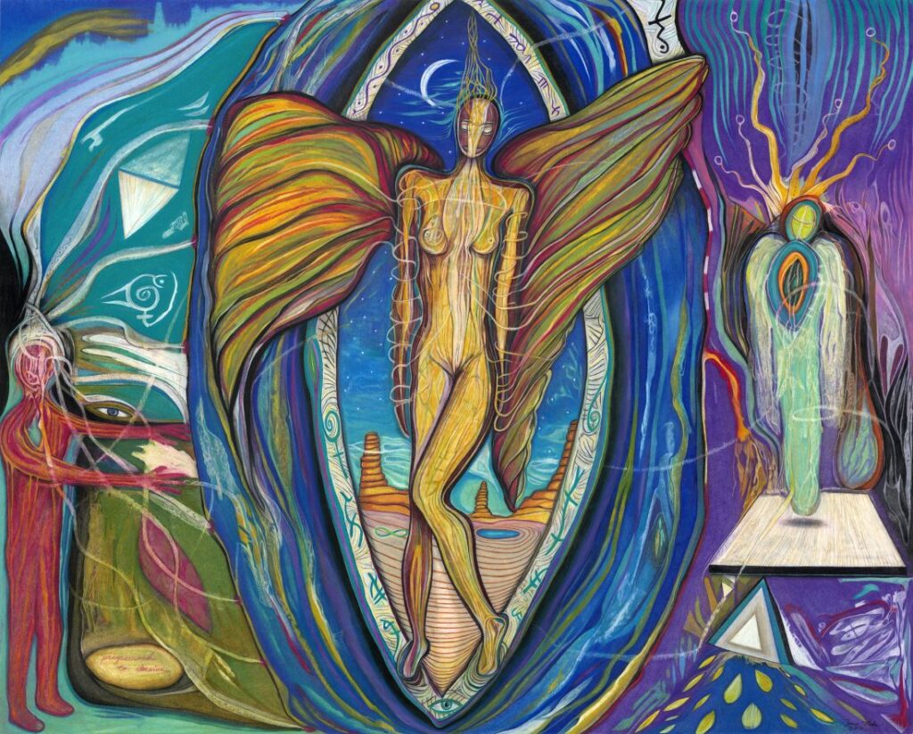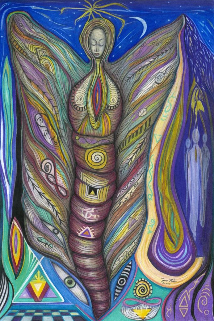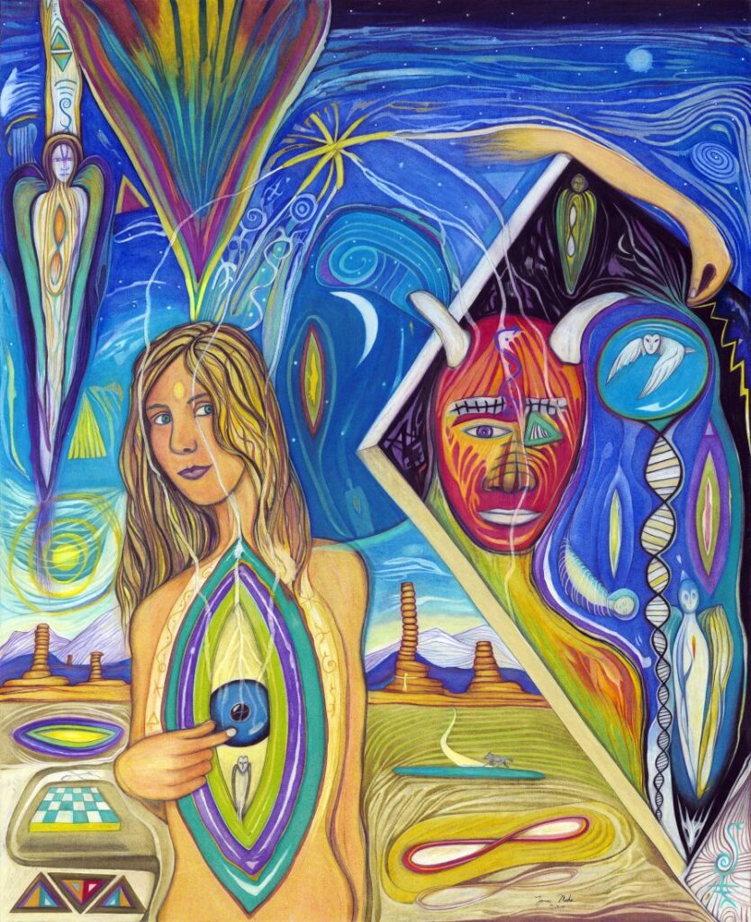 ウィングメーカーの膨大なコレクション全体の中でも最も複雑な絵画の一つですが、その意味はシンプルで率直です――世界と世界の境界が薄くなってきている、ということです。ソース・リアリティの微細な周波数を受信し、送信する能力は育まれなければなりません。そうでなければ、バランスを保つのは難しくなります。