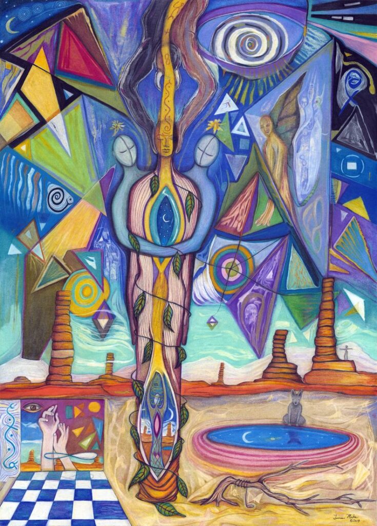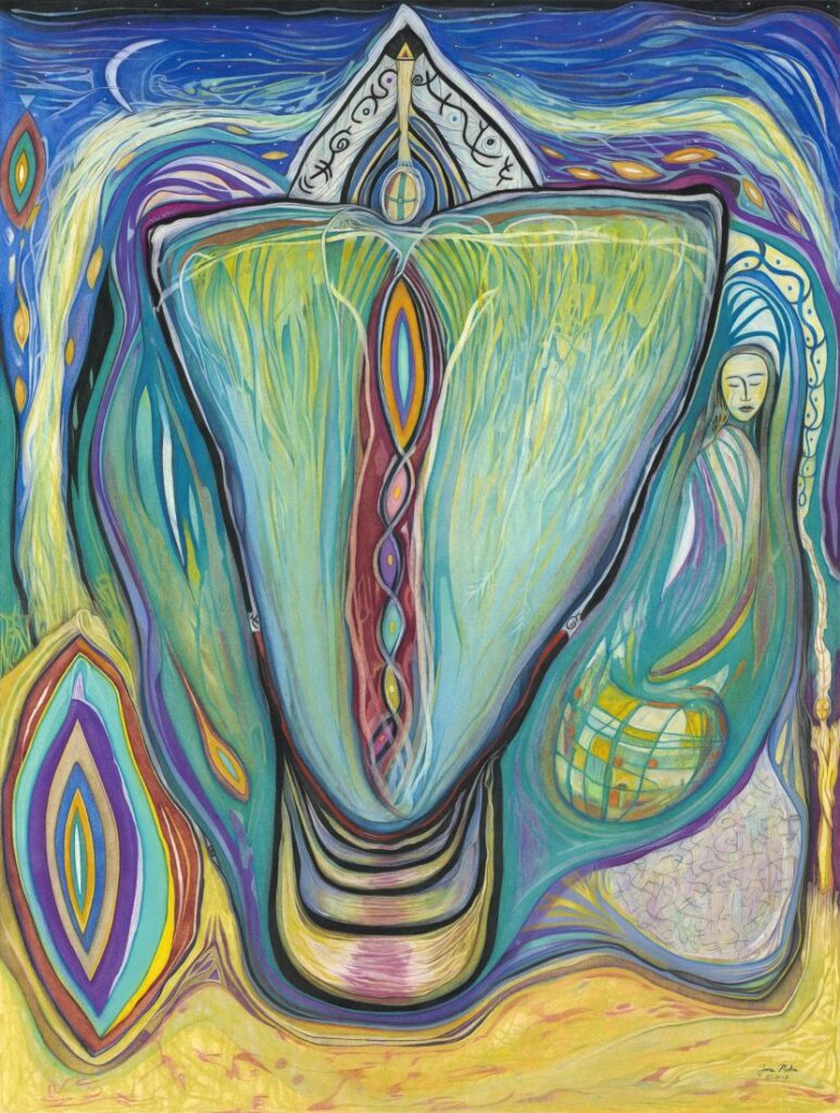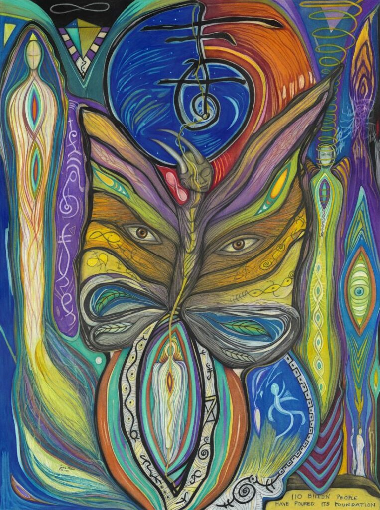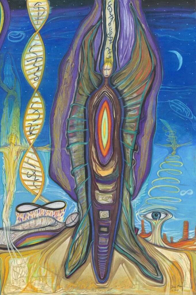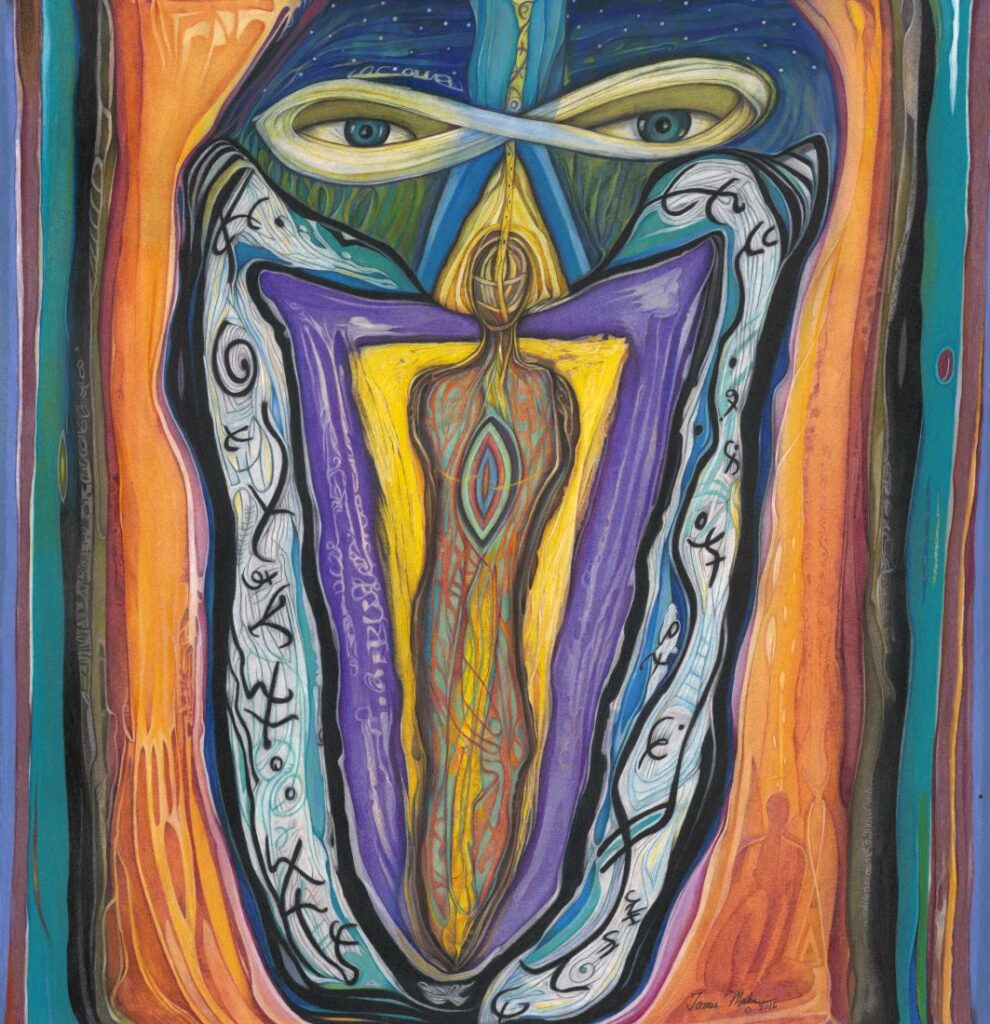 ウィングメーカーの膨大なコレクション全体の中でも最も複雑な絵画の一つですが、その意味はシンプルで率直です――世界と世界の境界が薄くなってきている、ということです。ソース・リアリティの微細な周波数を受信し、送信する能力は育まれなければなりません。そうでなければ、バランスを保つのは難しくなります。