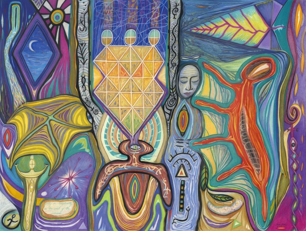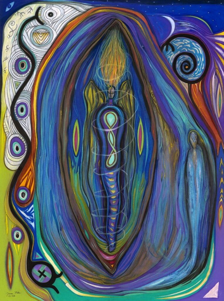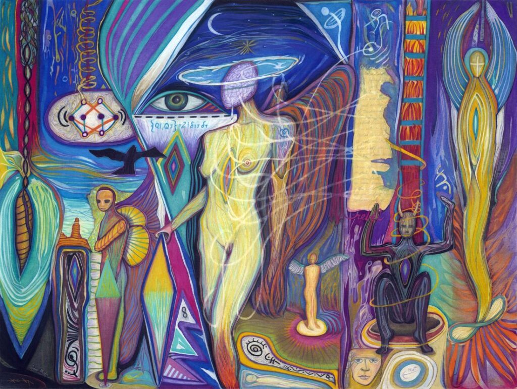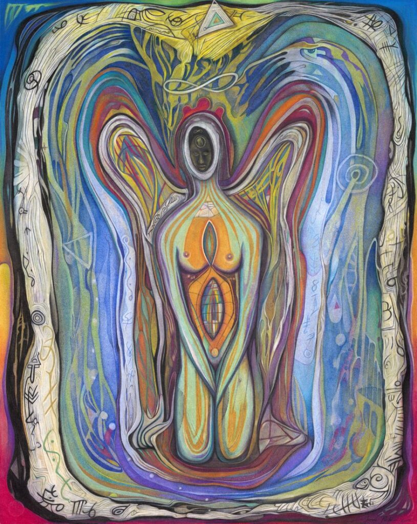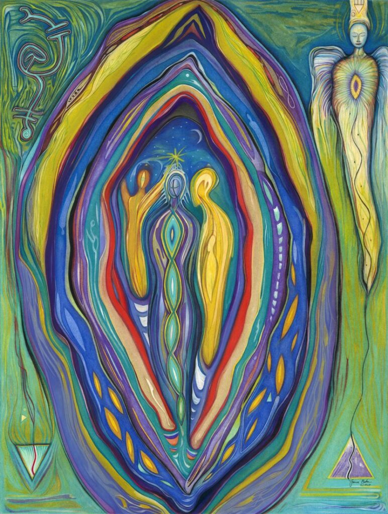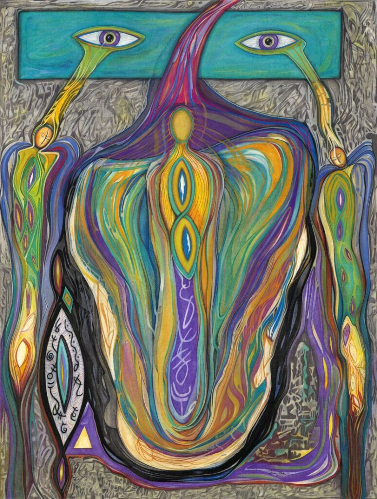 ウィングメーカーの膨大なコレクション全体の中でも最も複雑な絵画の一つですが、その意味はシンプルで率直です――世界と世界の境界が薄くなってきている、ということです。ソース・リアリティの微細な周波数を受信し、送信する能力は育まれなければなりません。そうでなければ、バランスを保つのは難しくなります。