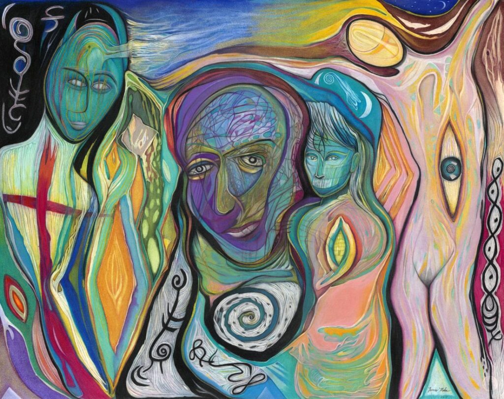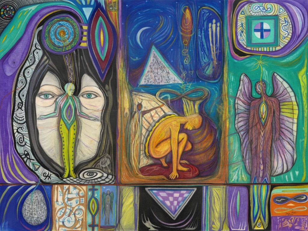 改めて、4つの存在が描かれた、非常に具象的な作品です。左側の角のある人物像と十字架には、宗教的な含意が感じられます。ですが、ウィングメーカーのアートにおいて用いられる「角」は、悪魔やサタンを指すものではなく、むしろ「地に足のついた状態(グラウンデッドネス:groundedness)」の象徴です。つまり、動物的本能が損なわれずに残っている、ということです。これは宗教的解釈に基づく善悪の判断ではなく、角のある人物が「動物的意識の状態に根ざしている」という心理学的な評価です。心理学で言えば、フロイト的には「イド(Id)」、ユング的には「影(シャドウ)」という用語で語られるかもしれません。